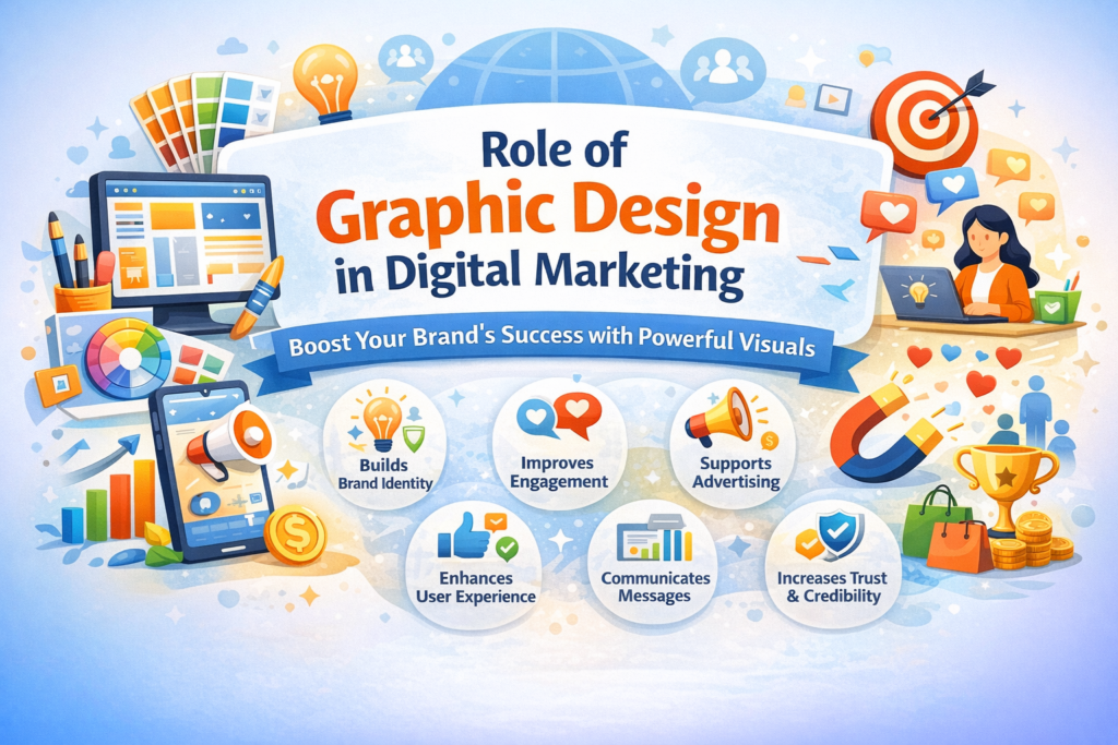 Graphic design plays a key role in website usability and user experience. Clean layouts, proper spacing, attractive visuals, and readable typography make websites easy to navigate. A well-designed website keeps visitors engaged and increases conversion rates.